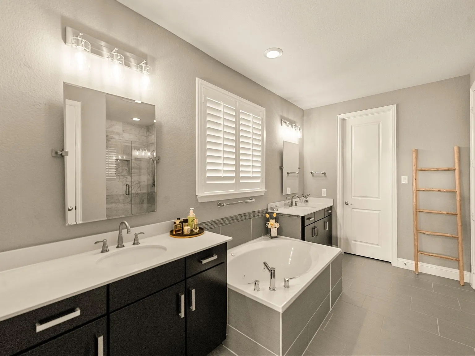 The spa-like master bath features $8,000 in upgrades, including granite vanities and custom lighting, creating a tranquil oasis for relaxation after a busy day.